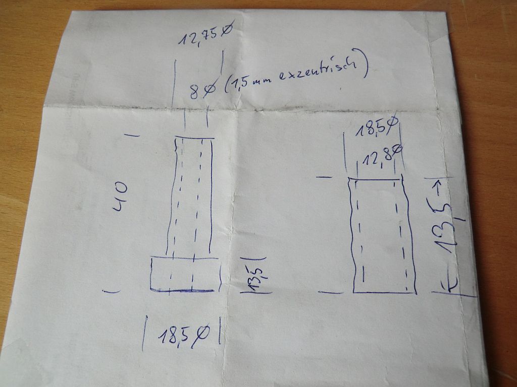 Man könnte aber auch eine 3-teilige Huber Buchse 10 x 40 mm mit der originalen 8er Schraube nehmen - und dadurch eine Exzentizität von 1 mm erreichen.