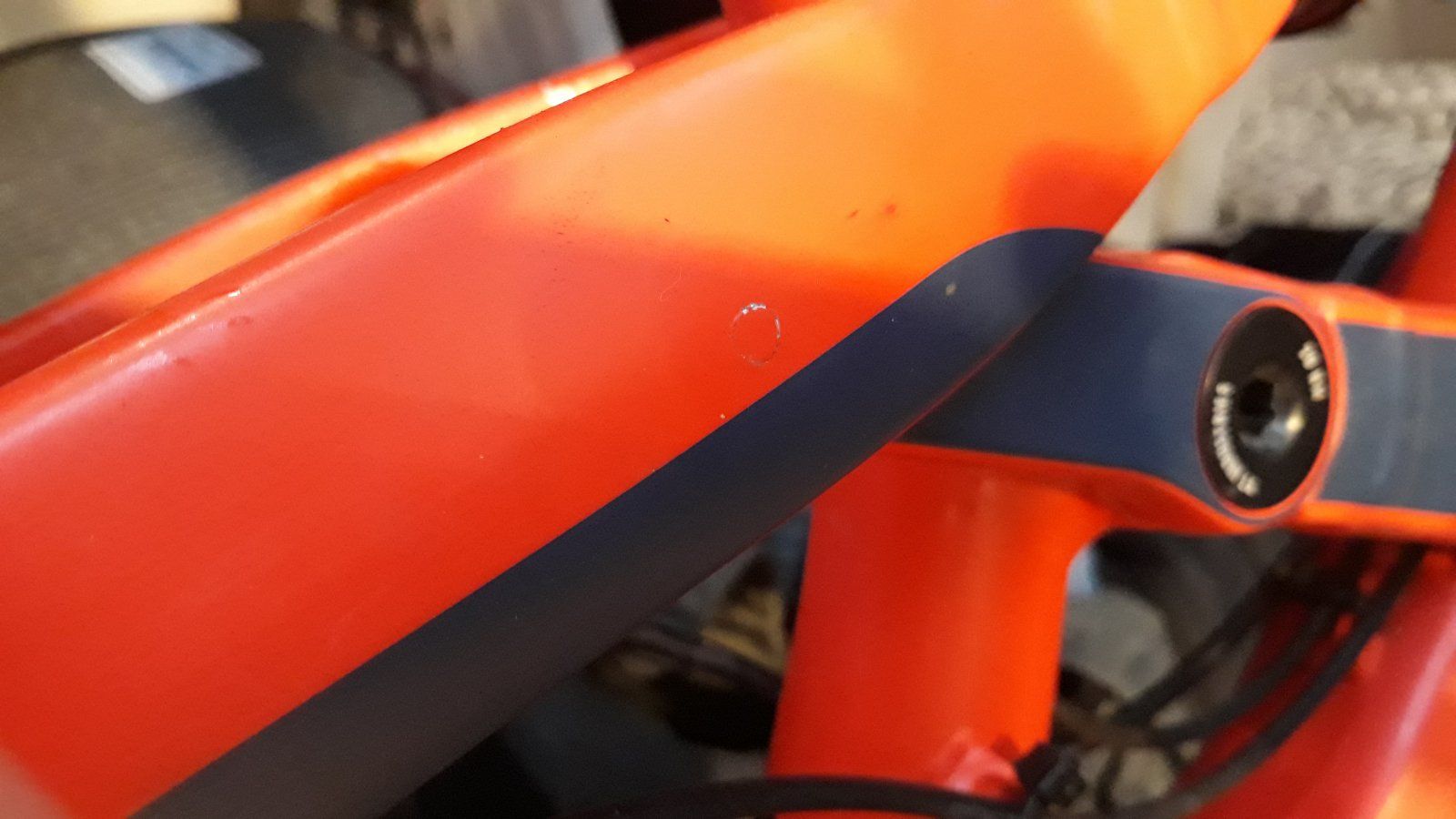 Als ich den Rahmen dann genau angeschaut habe ist mir auch noch aufgeffallen, das an der Sitzstrebe ein kreisrunder Lackabplatzer vorhanden ist, der gegenüber dem Eingeschweißten Auge zur Verbschraubung mit dem Umlenkhebel liegt. Super