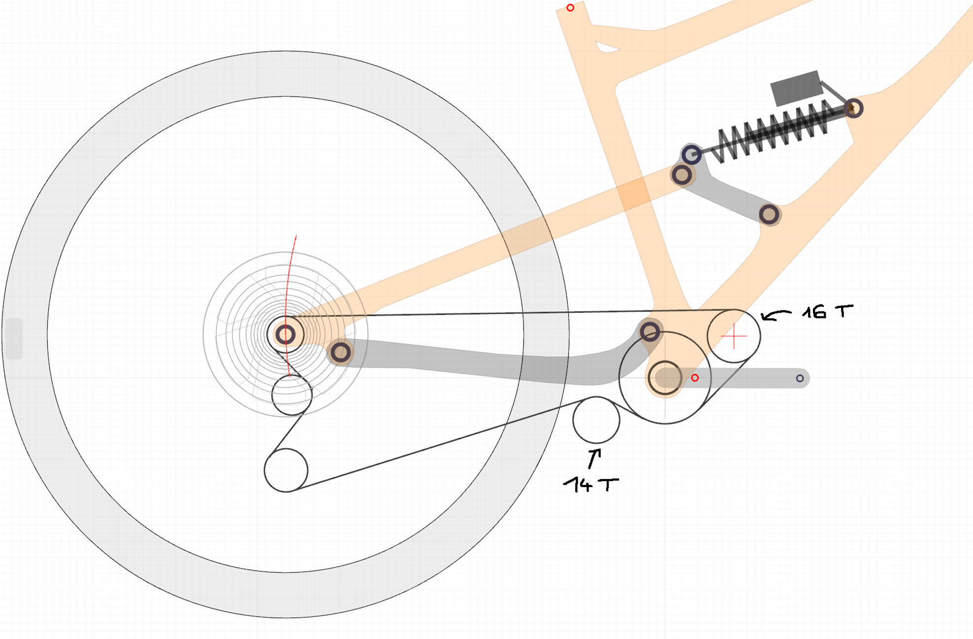 • größere Rollen sind leiser und effizienter, aber davor konnte ich eine maximal 14 T verwenden, da sonst beim Bottom-Out die Rolle mit der Kettenstrebe in Kontakt käme (Begrenzung nach unten) und mit noch höherer Position der Kette sich die Treteffizienz noch mehr verschlechter hätte (Begrenzung nach oben) -> jetzt sogar 18 T verwendbar