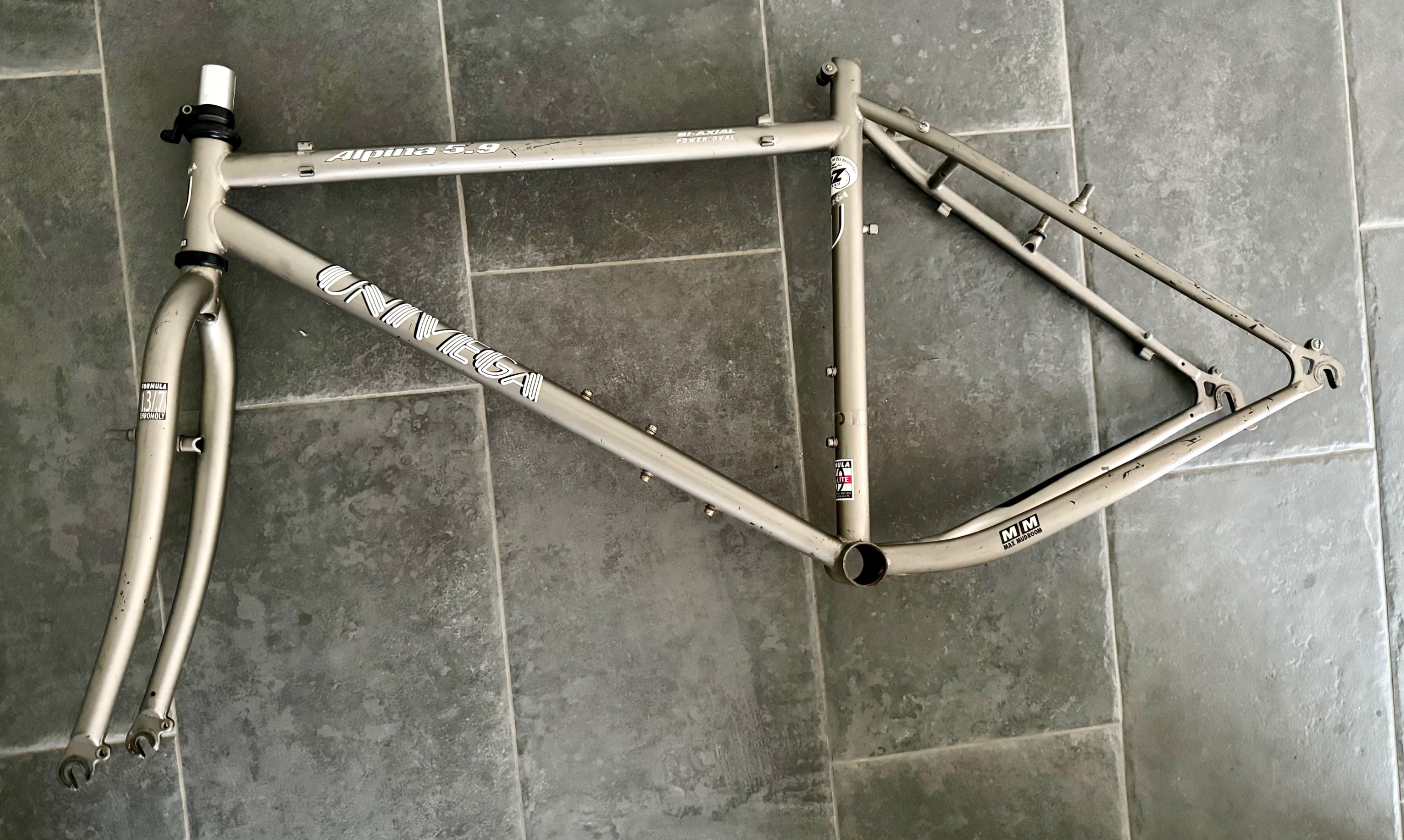 94er Univega Alpina 5.9 Rahmensatz 56,5cm Oberrohr Mitte-Mitte / 46cm Sitzrohr Mitte-Ende Hat seine Gebrauchsspuren, aber keine Dellen, keine Risse, kein Rostproblem - strukturell gesund. 40 Euro