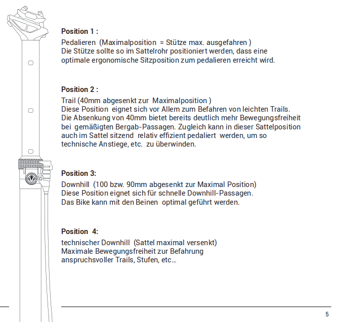 Genauso ist es! Die 200er passt perfekt. Ich habe nur ursprünglich die fixen Positionen falsch interpretiert. Die Zahlen habe ich als Position (von unten nach oben gemessen) interpretiert statt Absenkung (von der obersten Position nach unten gemessen). Deswegen empfand ich die 200er fälschlicherweise als suboptimal auf dem Trail. Dem ist aber zum Glück nicht so.