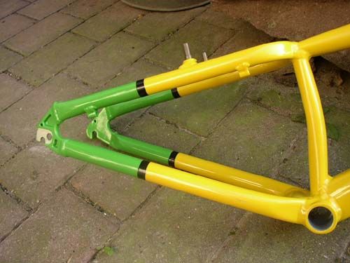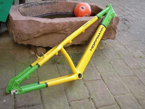 (2) Rahmen Marke "Pulo", genaue Geometriezeichnung auf Anfrage, Rahmen ist leider hinter am Sattelrohr gerissen, kann aber leicht geschweisst werden wenn man Ahnung hat, kompatibel zu Monty 2000-2003 Teilen ausser Aufsetzblech, hab die immer selber gebaut, eins gibt es mit dazu, ideal für Anfänger oder Selberschweißer, 25