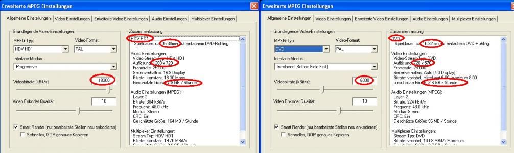So... anbei die Screenshots. Wie man sieht, sind die voreingestellen Exportparameter unterschiedlich, je nach Qualtät und Auflösung. Einmal HD-DVD- verglichen mit normaler DVD-Qualität.