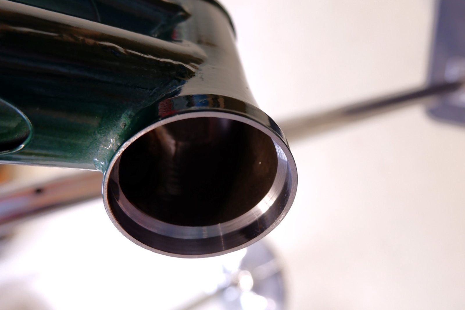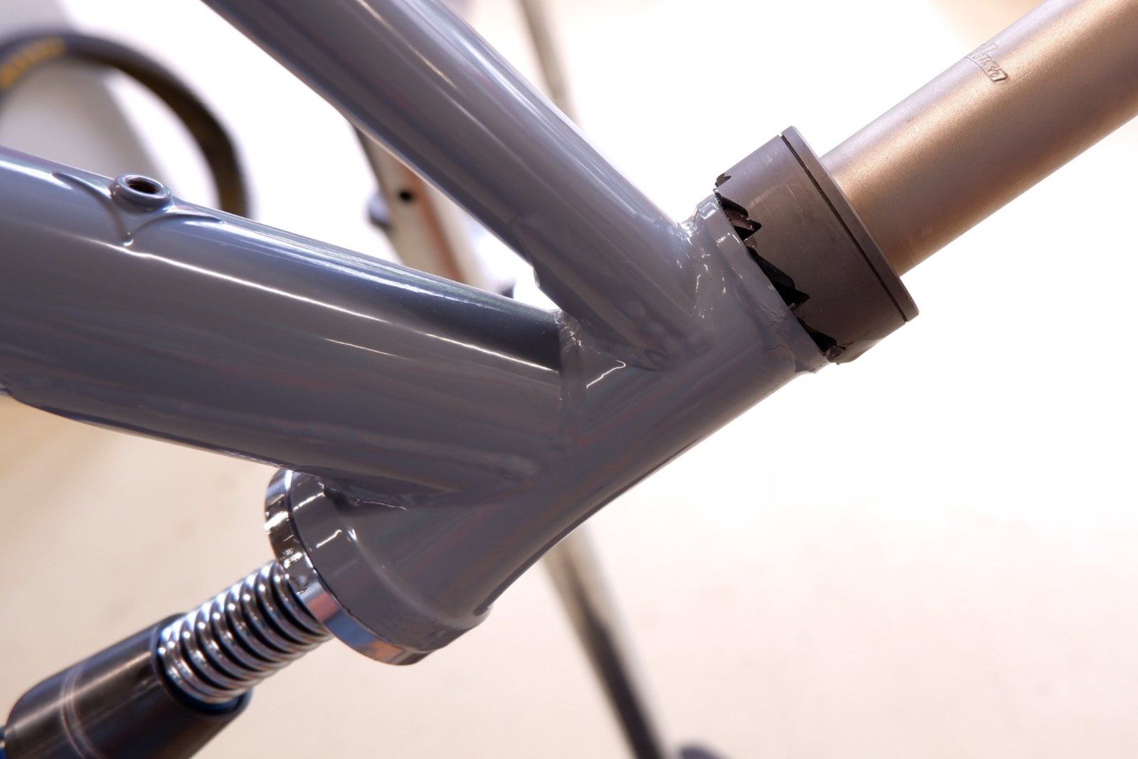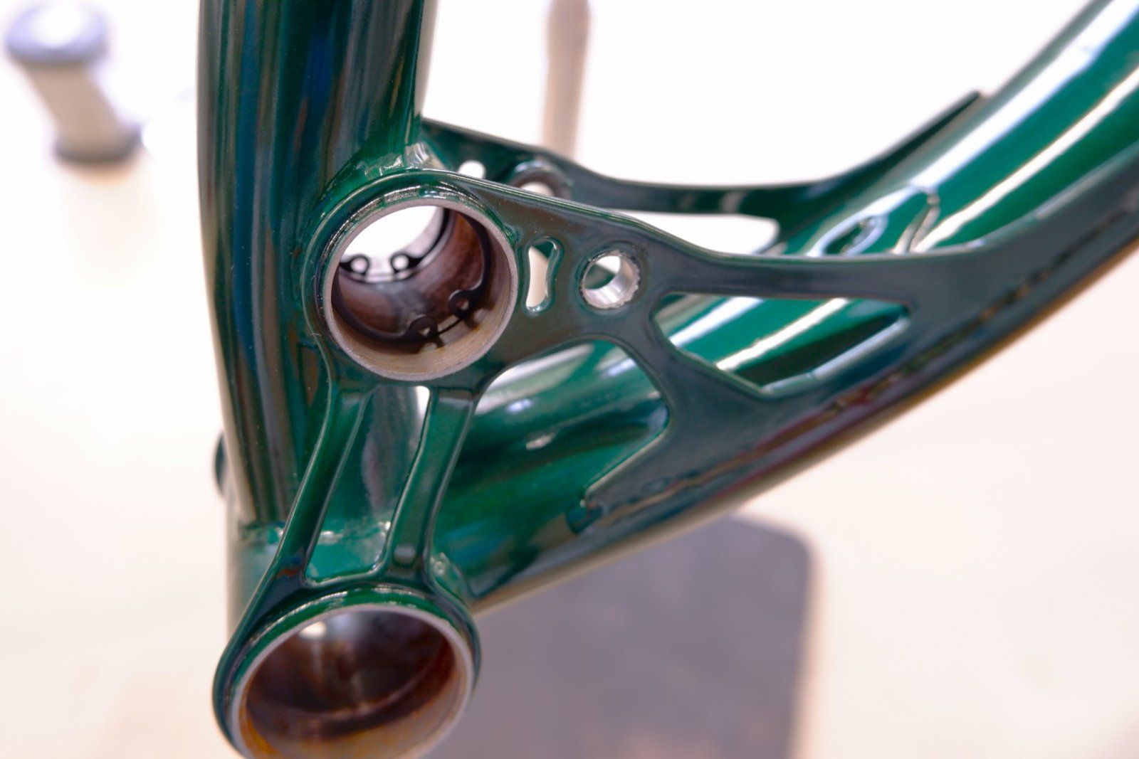 Die Hauprahmen waren nach dem Pulvern auch noch nicht ganz montagebereit. Trotz der Heatsinks beim Schweissen und der Abdeckungen beim Beschichten ist der Lagersitz und das Tretlager nicht ganz perfekt.