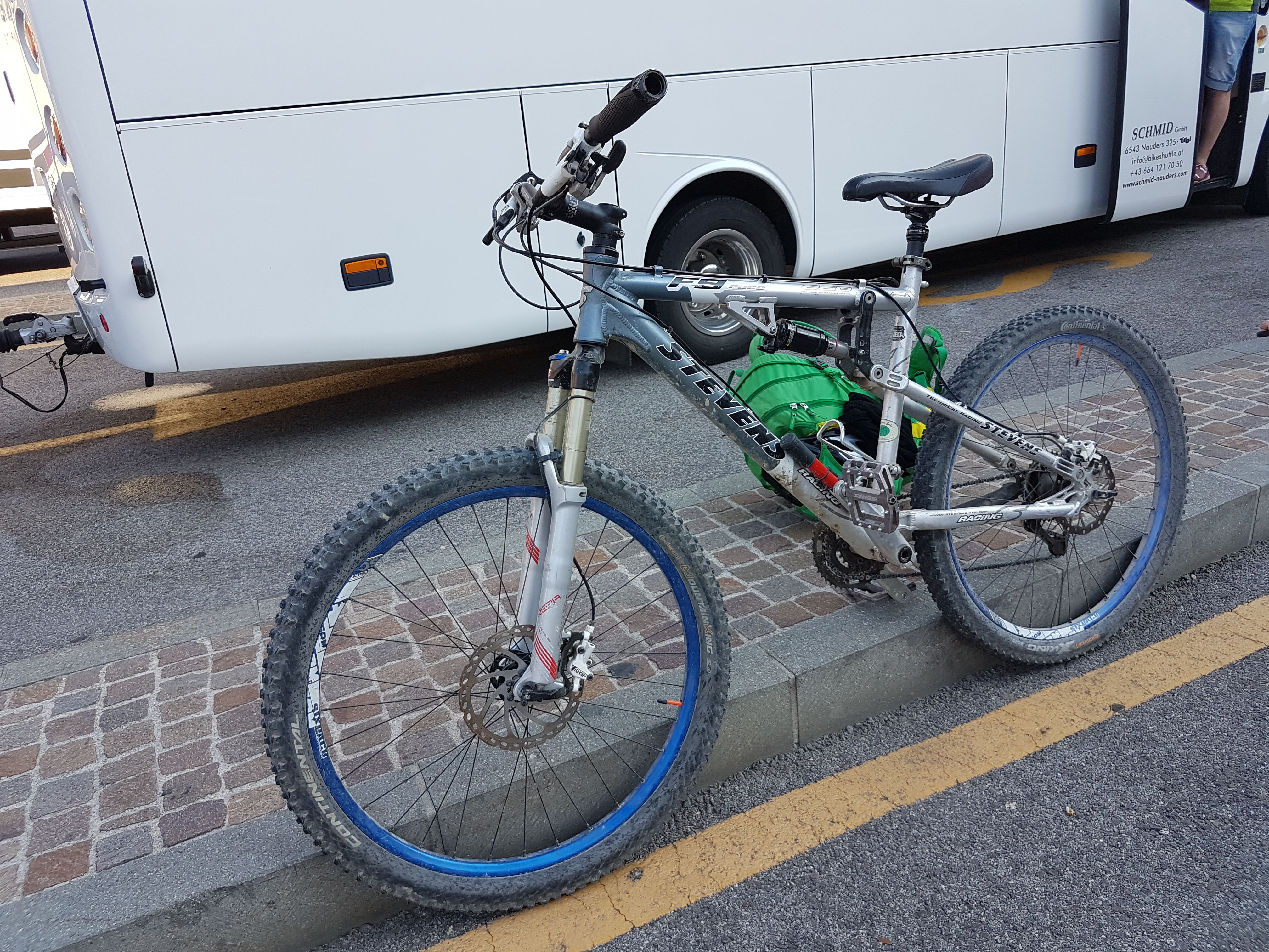 Und nun zum Eigentlichen: Die nun vierte Fahrt mit meinem ständig verschlimmbesserten Alteisen über die altehrwürdigen Alpen bestärkt mich in meiner Überzeugung, daß in den Herzen unserer Youngtimer all die Tugenden und Gene schlummern, die auch nach heutigen Maßstäben eine gehörige Portion Fahrspaß versprechen. Man muß nur die teilweise verborgenen Talente ab und an ein wenig herauskitzeln, wo uns der Wissensvorsprung aus der aktuellen Entwicklung des MTB-Sports punkto Geo und was-weiß-ich-noch gegenüber den Entwicklern unserer geliebten Alteisen enorm weiterhelfen kann.