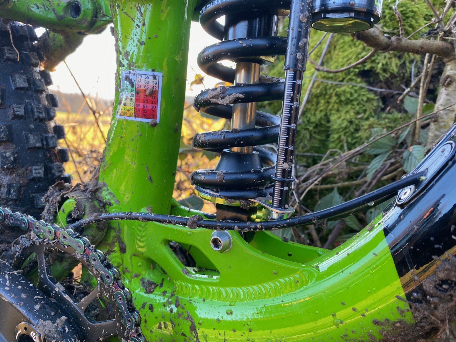 man beachte auf der linken Seite die sich selbst anpassende Tabelle als klebbares Oled-Display zur direkten Umrechnung der abgelesenen Werte der Skala in Prozent verbrauchten Federwegs...