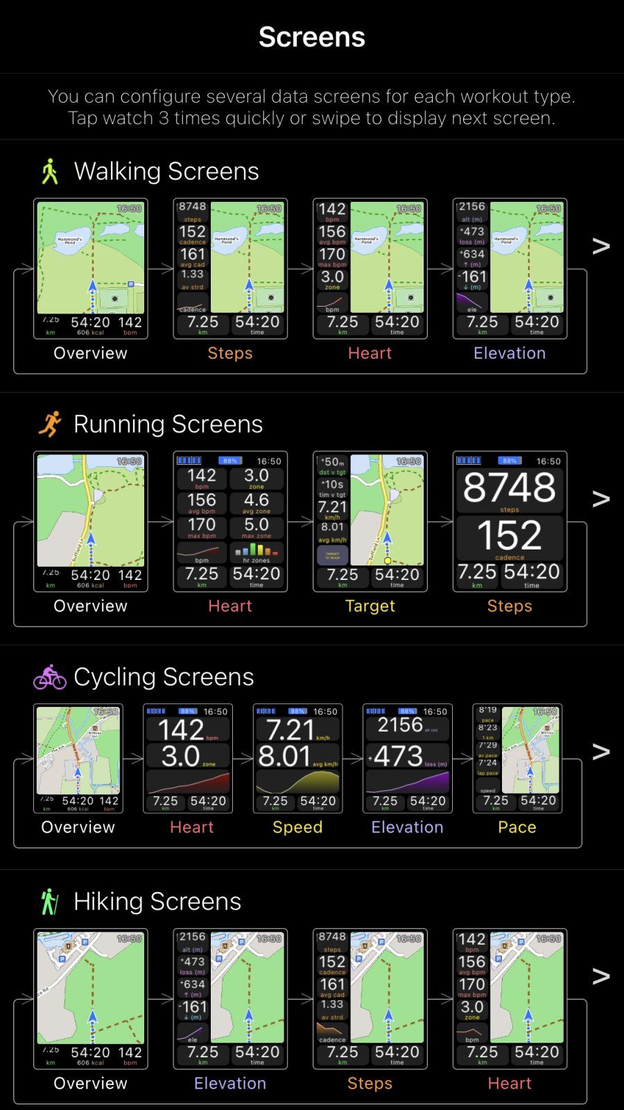 P.S. Hier sind ein paar Screenshots aus der App, wo die Einstellung vorgenommen werden als auch die Aktivitäten im Detail angeschaut werden können (auf der Watch ebenfalls möglich). Und wie zu sehen, wird so einiges am Display der Watch angezeigt, also es lässt sich zwischen den Screens wechseln. So hat man alle möglichen Werte für je entsprechende Aktivität-Art…