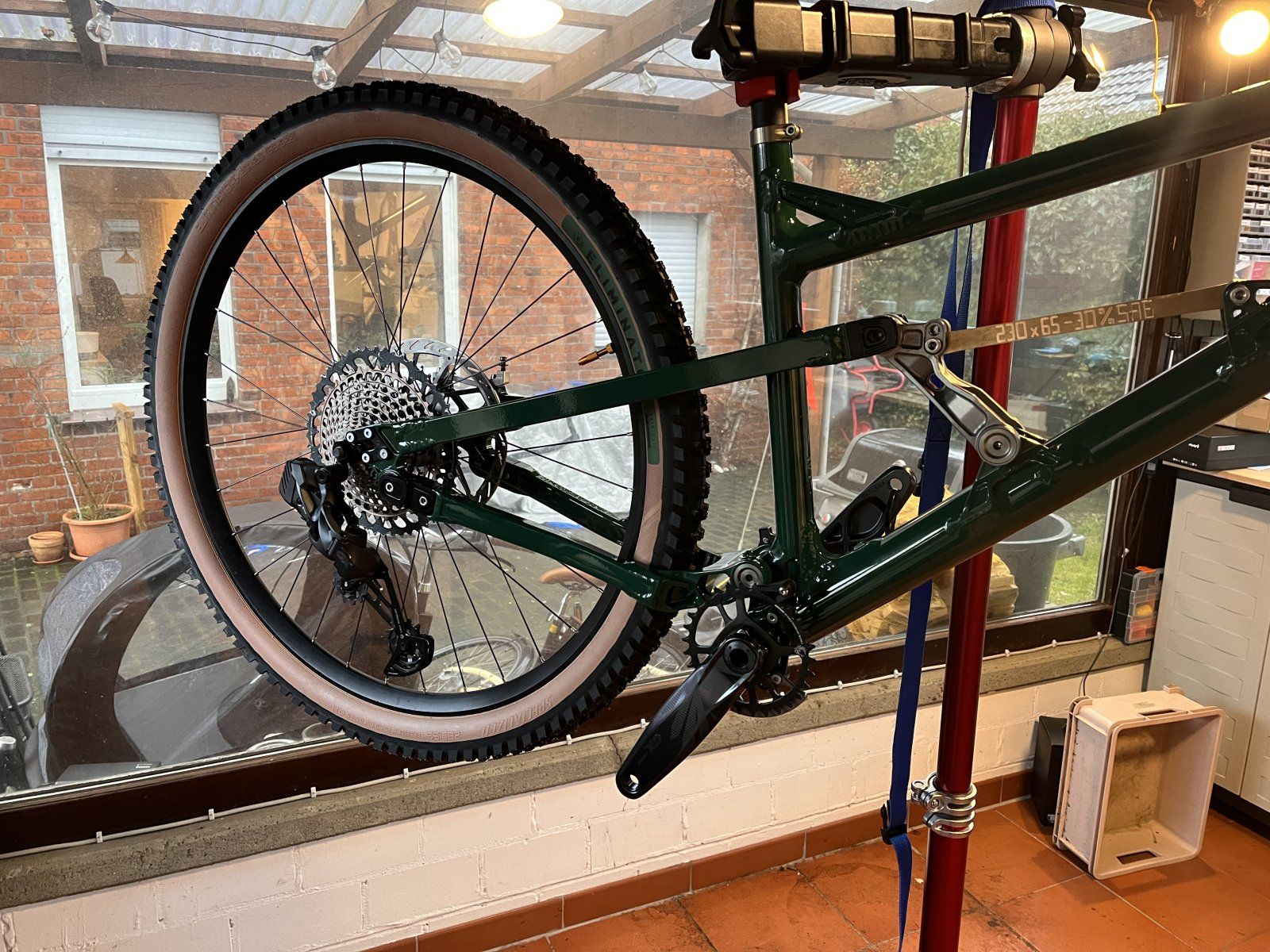 Bin wieder zuhause und platt. Musste aber zumindest noch alle Anbauteile an den Rahmen knallen und den Dämpfer mal reinhängen. Der Rahmen wiegt mit allen Anbauteilen, Dämpferschrauben und Steckachse 3,9kg (laut meiner Kofferwaage), find ich ok. Hab leider versäumt ihn vor der der Aktion zu wiegen, Volker meinte aber dass eine Pulverbeschichtung so um die 120g wiegt.