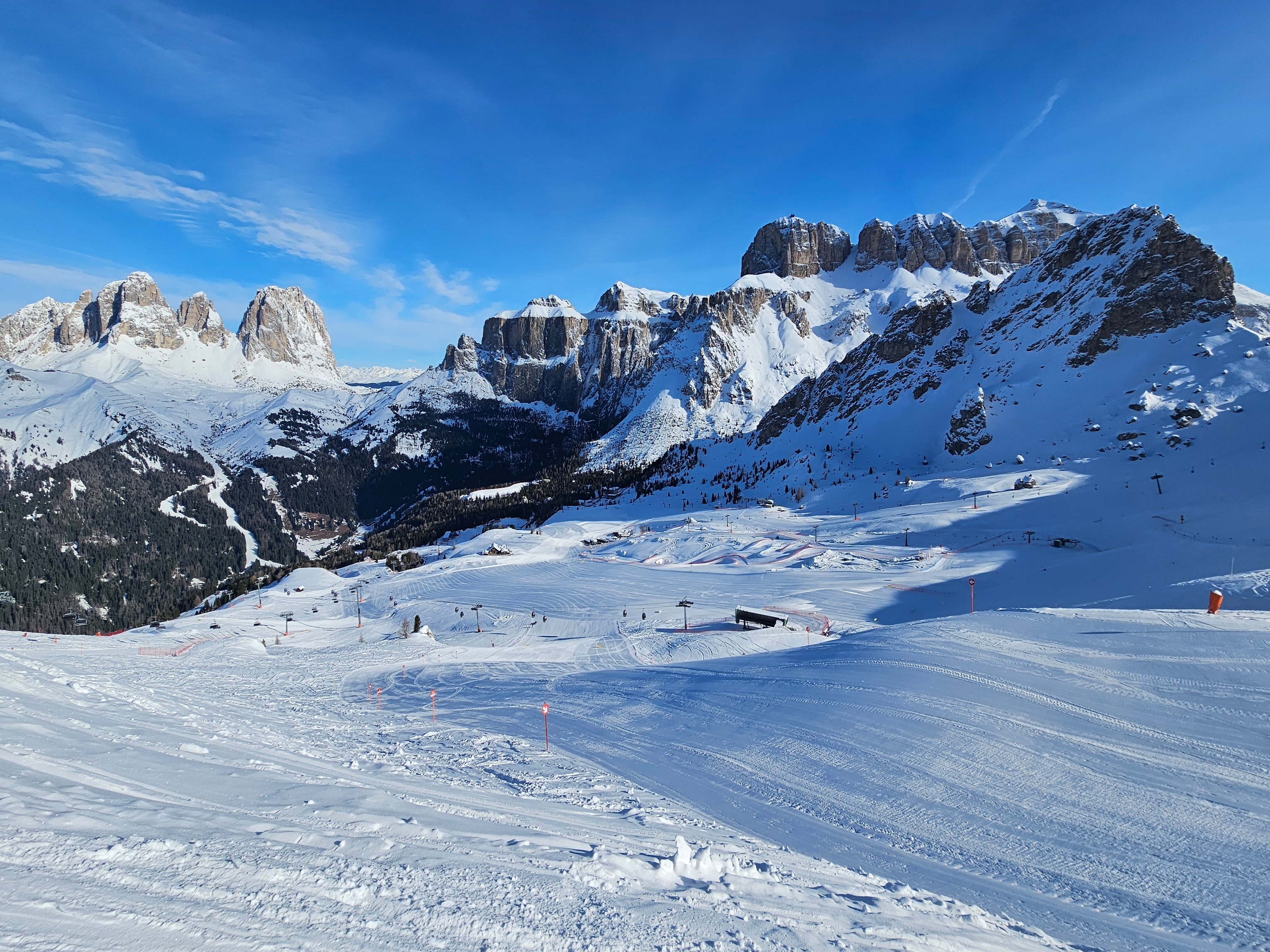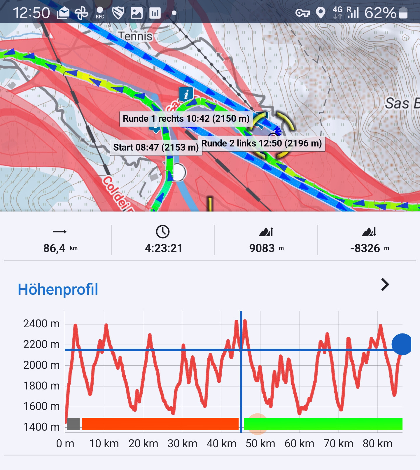Orange haben wir auch schon drei Runden geschafft. Zeit für Nr,4 blieb noch, da müsste aber wirklich alles passenDas erfordert untenrum bei der großen Gralbagondel ziemlich viel anschieben, um diese Jahreszeit vermutlich sogar Skier abschnallen. Lohnt nicht, zeitlich. Den sinnlosen Mini-Sessel auf der weiteren Abfahrt nach Wolkenstein strafe ich allerdings meist mit Verachtung, 30 Sekunden skaten bergauf tun's auch.