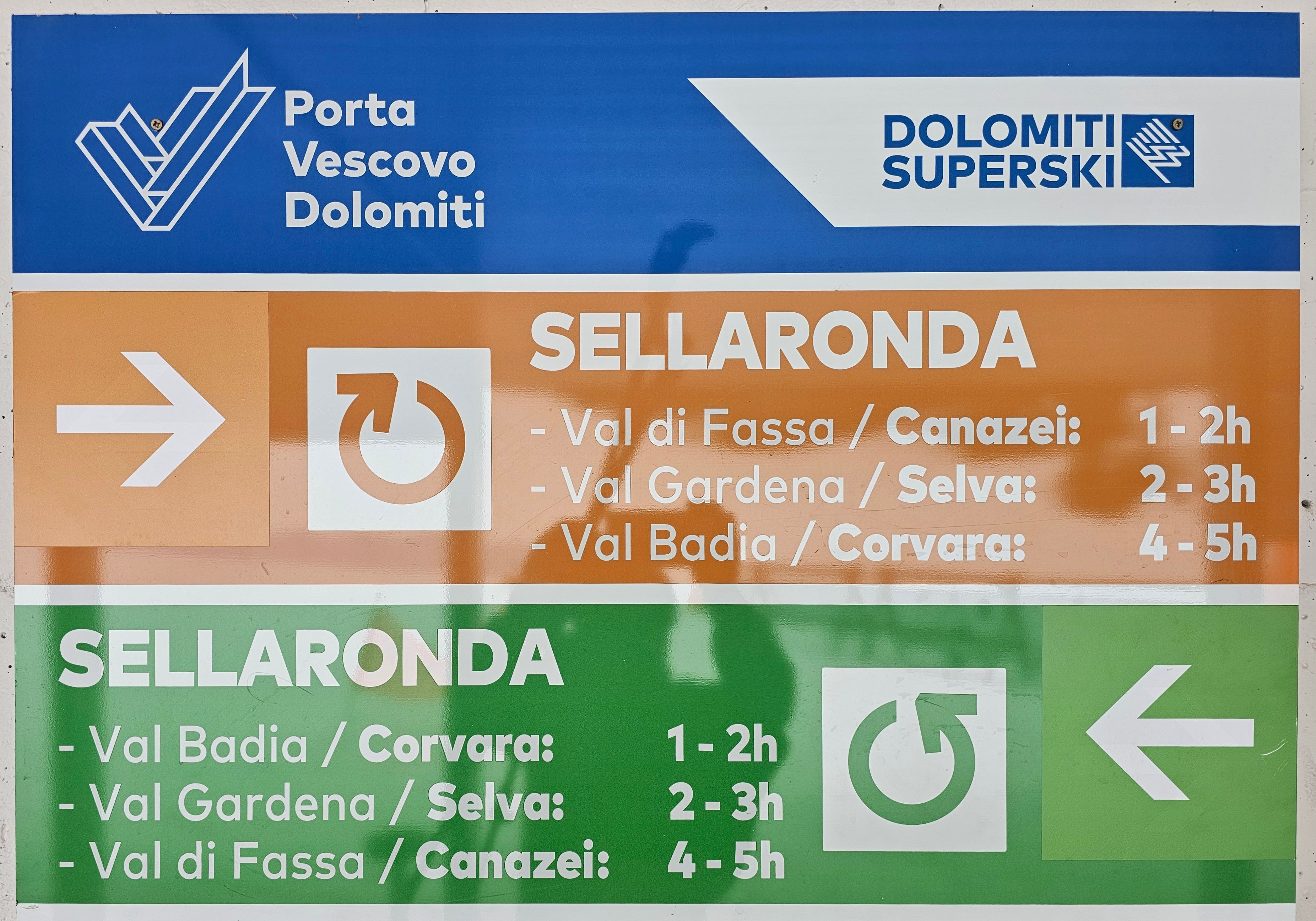 In der grünen Richtung kann man sich den Alpenrose-Sessel auf der Abfahrt nach Arabba sparen: 5 Höhenmeter Brücke bergauf schieben. Der Val-Setus-Sessel bei der Jimmyhütte auf dem Uphill zum Grödner Joch ist auch nutzlos und kann mittels Offpiste-Querung in dreißig Sekunden ignoriert werden. Trotzdem dauert Grün einfach ein paar Minuten länger, sind halt mehr Lifte.