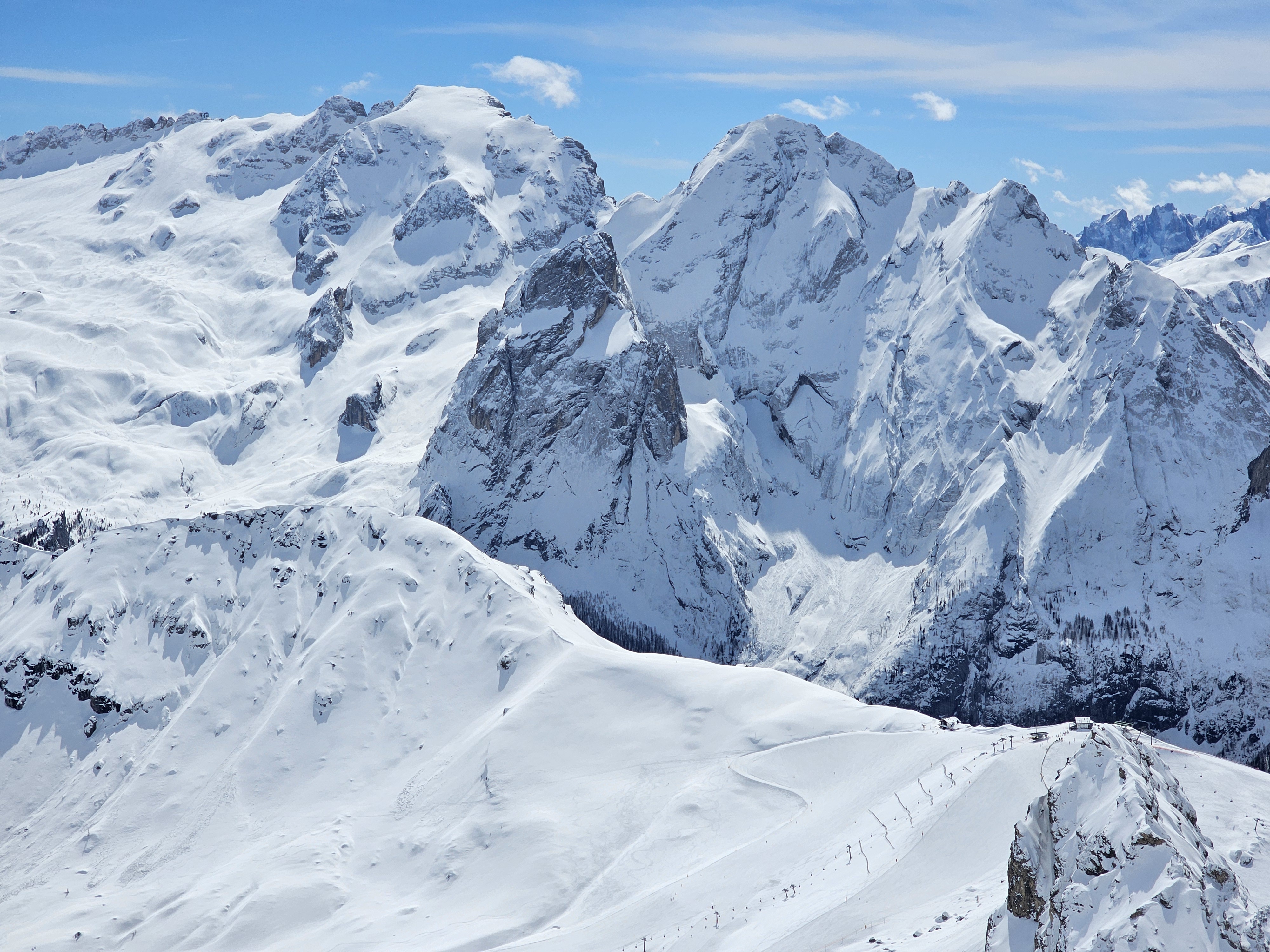Ich versteh dieses Sommer-/Wintergipfel Ding an der Marmolada ehrlich gesagt nicht. Denn mit "Wintergipfel" ist die Punta Rocca gemeint, weil Punta Penia (der Gipfel der Marmolada) für den 0815 Tourengänger eine recht anspruchsvolle Tour ist.die motivation für den marmolada-"sommergipfel" verstehe ich tatsächlich auch wenig. auch vom "wintergipfel" aus ist man doch (gerade bei dem "betrieb" jetzt) schnell in alpiner abgeschiedenheit, sobald man die piste verlässt? und ganz grob gesagt, erschließen beide gipfel den gleichen nordhang.