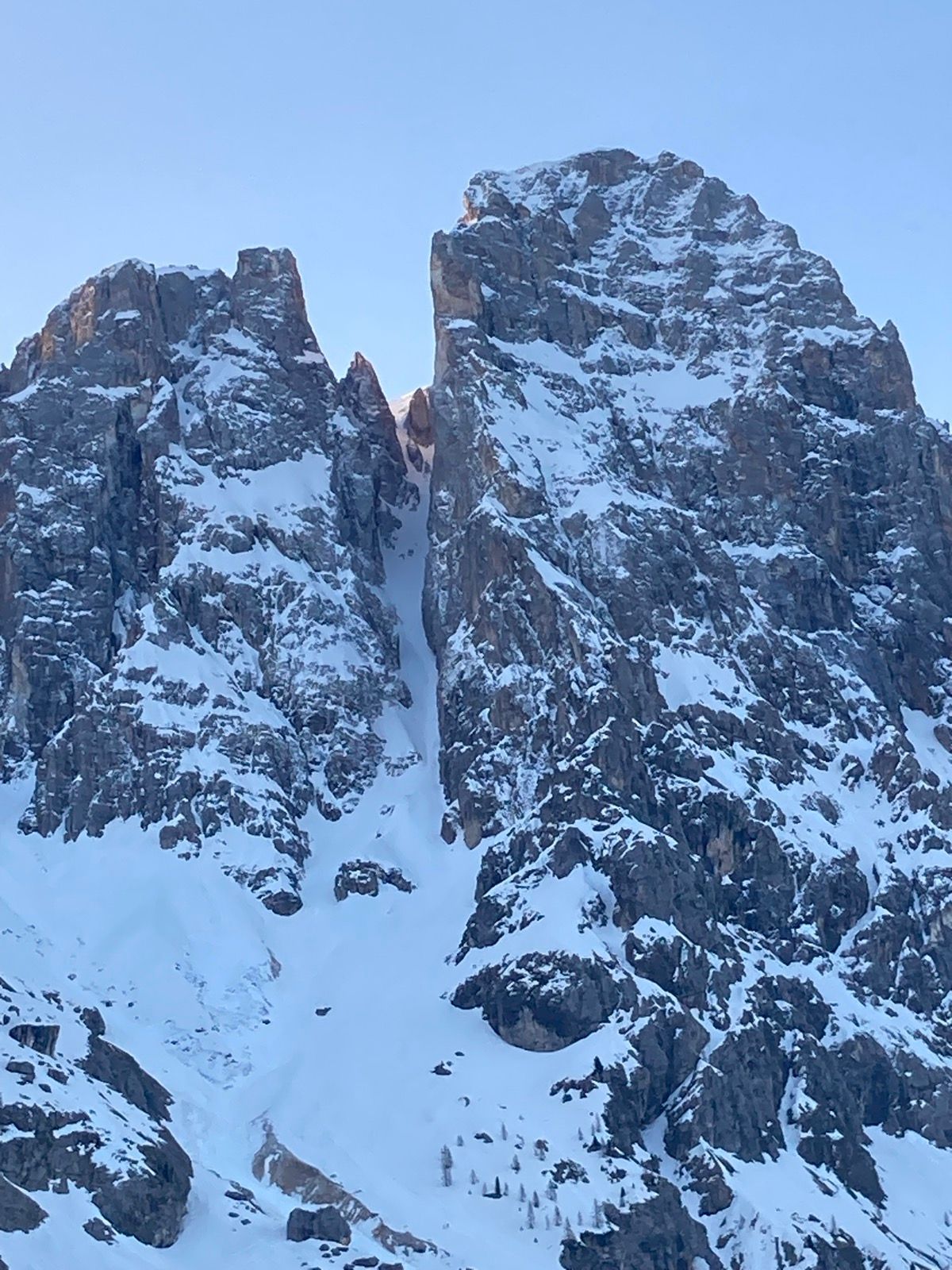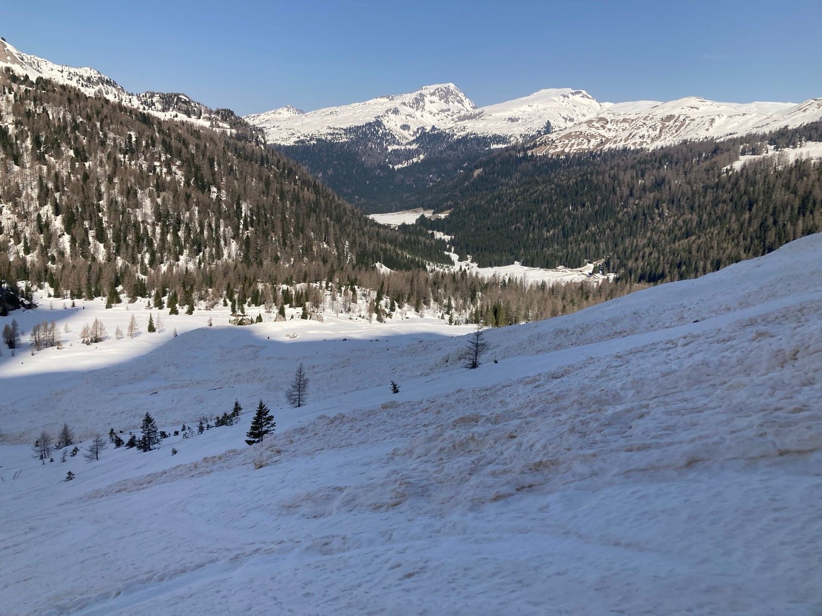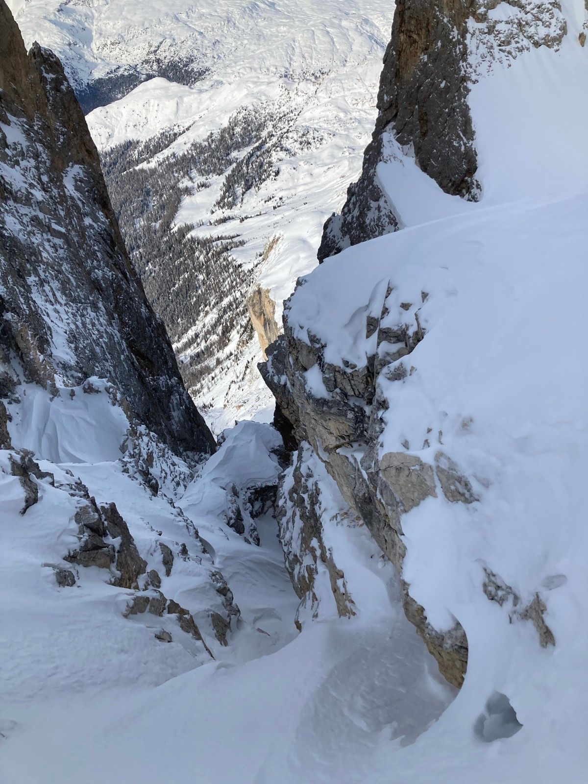 Allerdings wäre es eine einmalige Gelegenheit gewesen, nonstop vom Gipfel der Cima dei Bureloni mit Skiern abzufahren, das geht quasi nie. Aber ab dem Passo Bureloni, also oberhalb des Ausstiegs der Rinne, war mir die Situation nicht ganz geheuer, nach der Situation an der Marmolada tags zuvor. Und wenn man da mitgerissen wird, landet man ein paar hundert Meter tiefer in der Rinne, mit Glück dotzt man unterwegs ein paar mal auf. Im Nachhinein ärgere ich mich aber doch, ich denke es wäre safe genug gewesen.