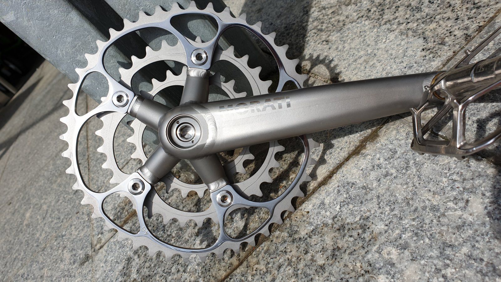 Die langen Aluschrauben fürs kleine Blatt gibt's kaum noch. Muss sie irgendwann mal noch enteloxieren. Gab keine silbernen mehr. Fällt alles weg, kaum noch 26er und 3-fach ebenso out. Leider.