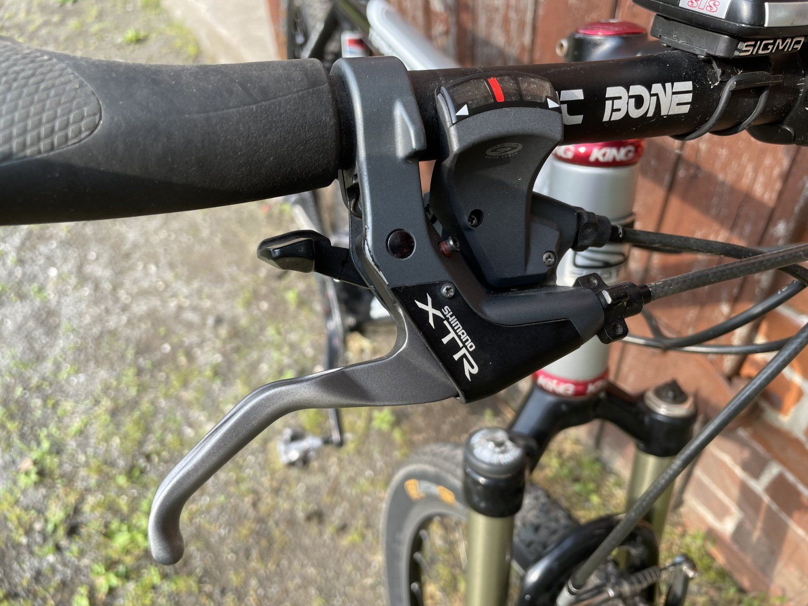 Schaltung + Antrieb bestehen aus einem lustigen Mix aus Deore Shiftern, LX Naben und XT Umwerfer + Schaltwerk. Sind jedoch 1 bis 2 Generationen jünger als der Rahmen. Die Bremshebel sind von Avid.