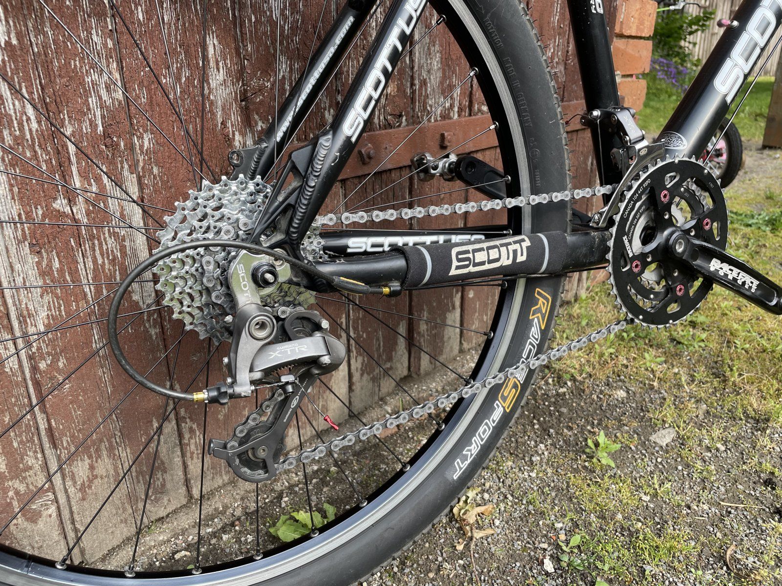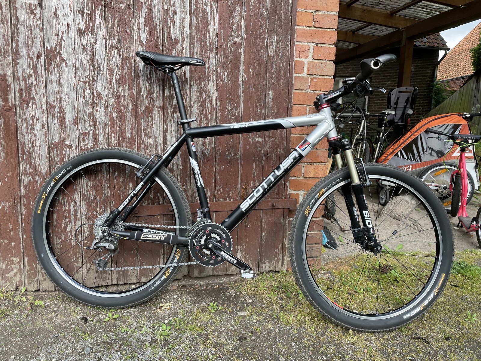 Mein geliebtes Scott, welches bereits ca. 15 Jahre in meinem Besitz ist (gebraucht gekauft) und nach und nach verfeinert wurde. Geändert werden definitiv noch Sattelstütze, Vorbau und Lenker auf zeitgemäße und leichtere Teile, wahrscheinlich Tune.