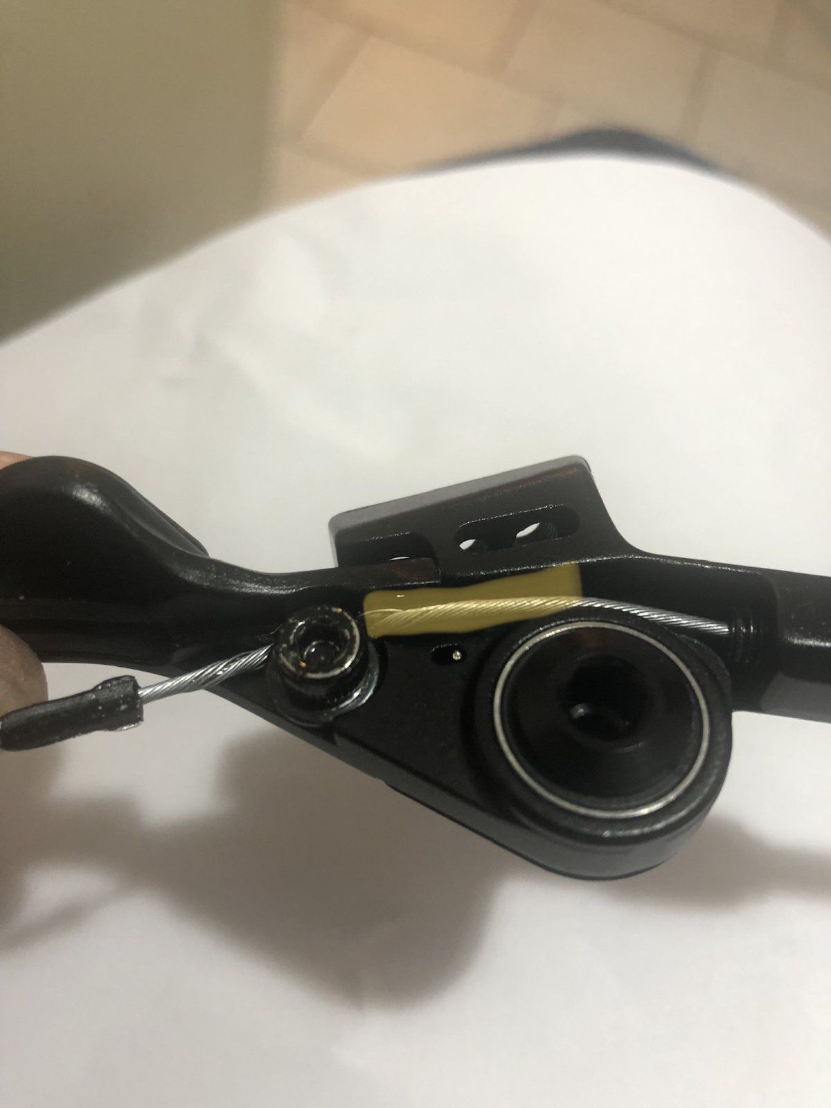 Bilder mit meinem Hebel und gelben Markierungen anbei. Ich habe den Eindruck, das eigentlich im Bereich der gelben Markierung der Hebel ein Art Aussparung/Kanal haben müsste um das Seil zu führen.