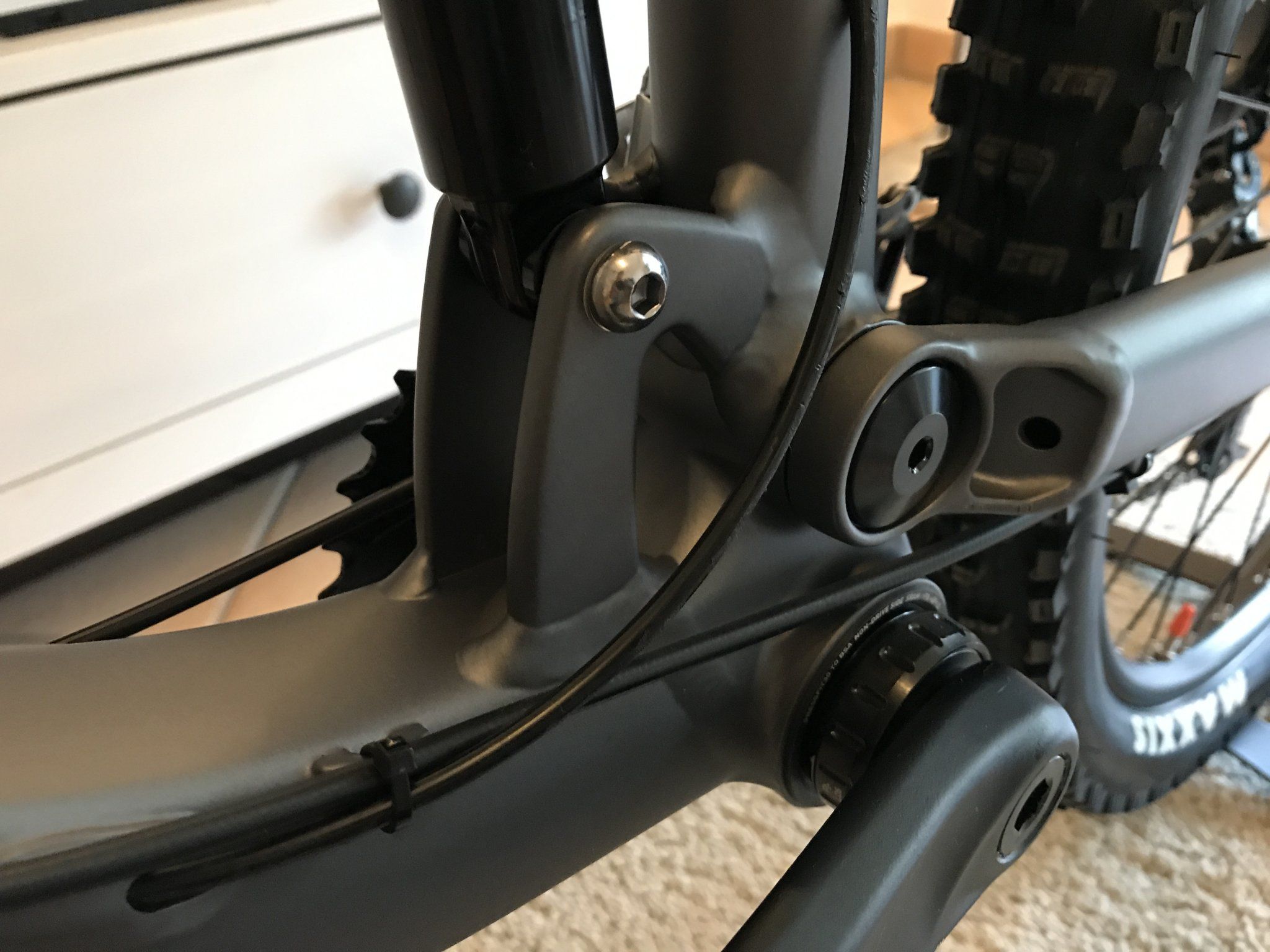 Pulse verwendet am RS1 einen Mix aus innen- und außenverlegten Zügen: Schaltzug und Variostützen-Leitung liegen im Inneren des Hauptrahmens, während die Bremsleitung außen verlegt ist. Auch im Hinterbau geht es so weiter: Schaltzug innen, mit schöner Führung zwischen Leitungsaustritt und Schaltwerk, Bremsleitung außen, auf der Innenseite der Kettenstrebe. Abgesehen von einem dünnen, dämpfenden Kleber auf der Kettenstrebe befindet sich am RS1 kein Rahmenschutz. Ein Trinkflaschenhalter findet im Rahmendreieck Platz.